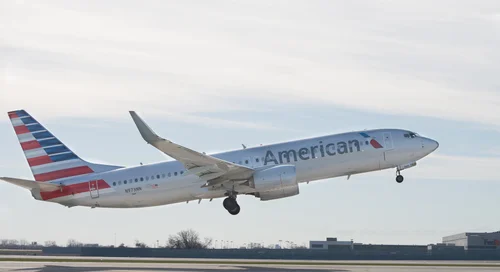 An American Airlines (American Eagle) Jet taking off at Ohare with Chicago in the background.